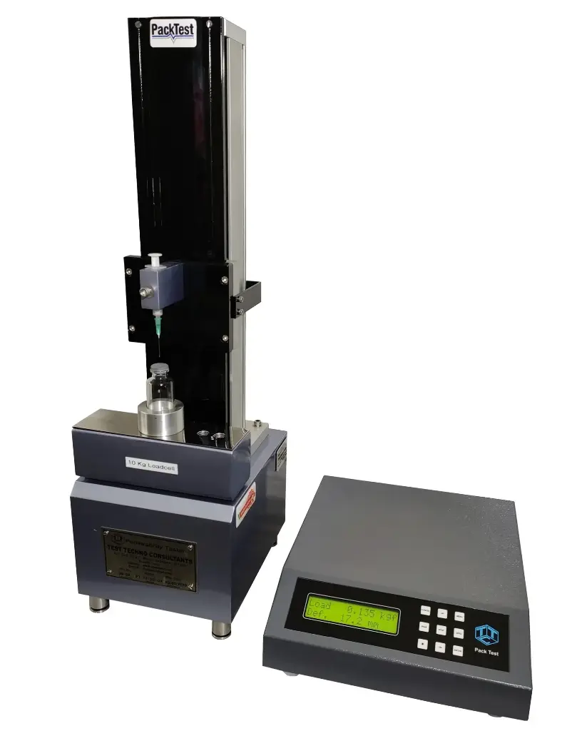An equipment to test the penetration force of rubber stoppers used in pharmaceutical vials.